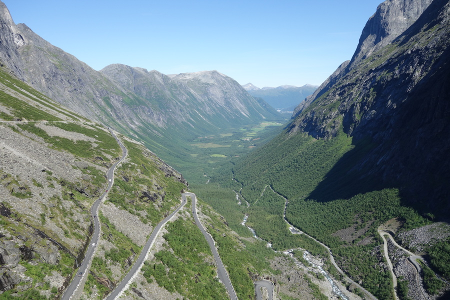 Von Trondheim aus ging es dann wieder mit dem Zug über Dombås nach Åndalsnes, wo wir für vier Nächte blieben. Ab dem ersten Morgen hatte es auch mit dem Wetter geklappt, und wir hatten endlich das Wetter, das ich mit Norwegen-Urlauben verbinde: 22-26°C und Sonnenschein. Natürlich muss man in dieser Gegend Trollstigen und Geirangerfjord besuchen, wir waren außerdem noch am Mardalsfossen und wanderten aufs Romsdalseggen, wo ich einen der beeindruckensten Blicke diesen Urlaubs gesehen habe.