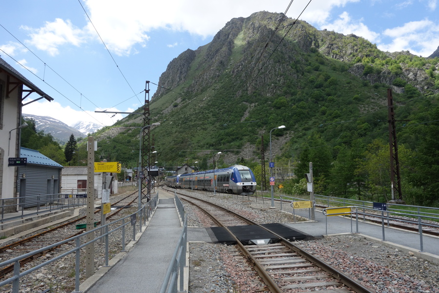 Der nächste Zug leider nicht. Erst mit 25 Minuten Verspätung ging es los, und das bei 19 Minuten Umsteigezeit am nächsten Bahnhof. Oh-oh. Auf einer vielbefahrenen eingleisigen Strecke an einem Werktag (außerhalb von Frankfurt ist der Wäldchestag dies ja nun mal) wuchs die Verspätung auf bis zu 33 Minuten an, um dann kurz vor dem Durchbruch auf die andere Seite der Pyrenäen (bei L’Hospital-pres-l’Andorre) auf einmal sehr klein geworden zu sein. Nun ja, der Anschluss hätte eh gewartet, und dann ging es in der „Pyrenäen-Metro“, mit dem Gelben Zug, in Richtung Mittelmeer. Diese Schmalspurbahn hielt leider lange nicht, was sie versprach; die Trassierung ist wesentlich kurviger, als es vom Gelände her nötig erscheint, nimmt dafür aber alle möglichen Orte mit. Nur keine Fahrgäste – es war doch ziemlich leer.